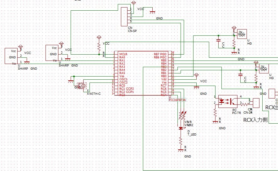 簡単に説明すると左下のゲジゲジがPICというマイクロコントローラーです。16F873Aって書いてありました。