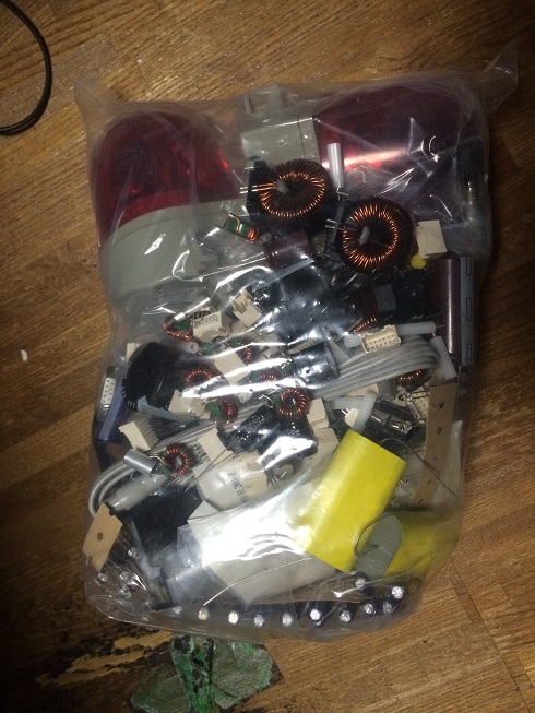 まずはこちら。赤色灯やら謎のコンデンサやらコイルが詰まったジャンク袋