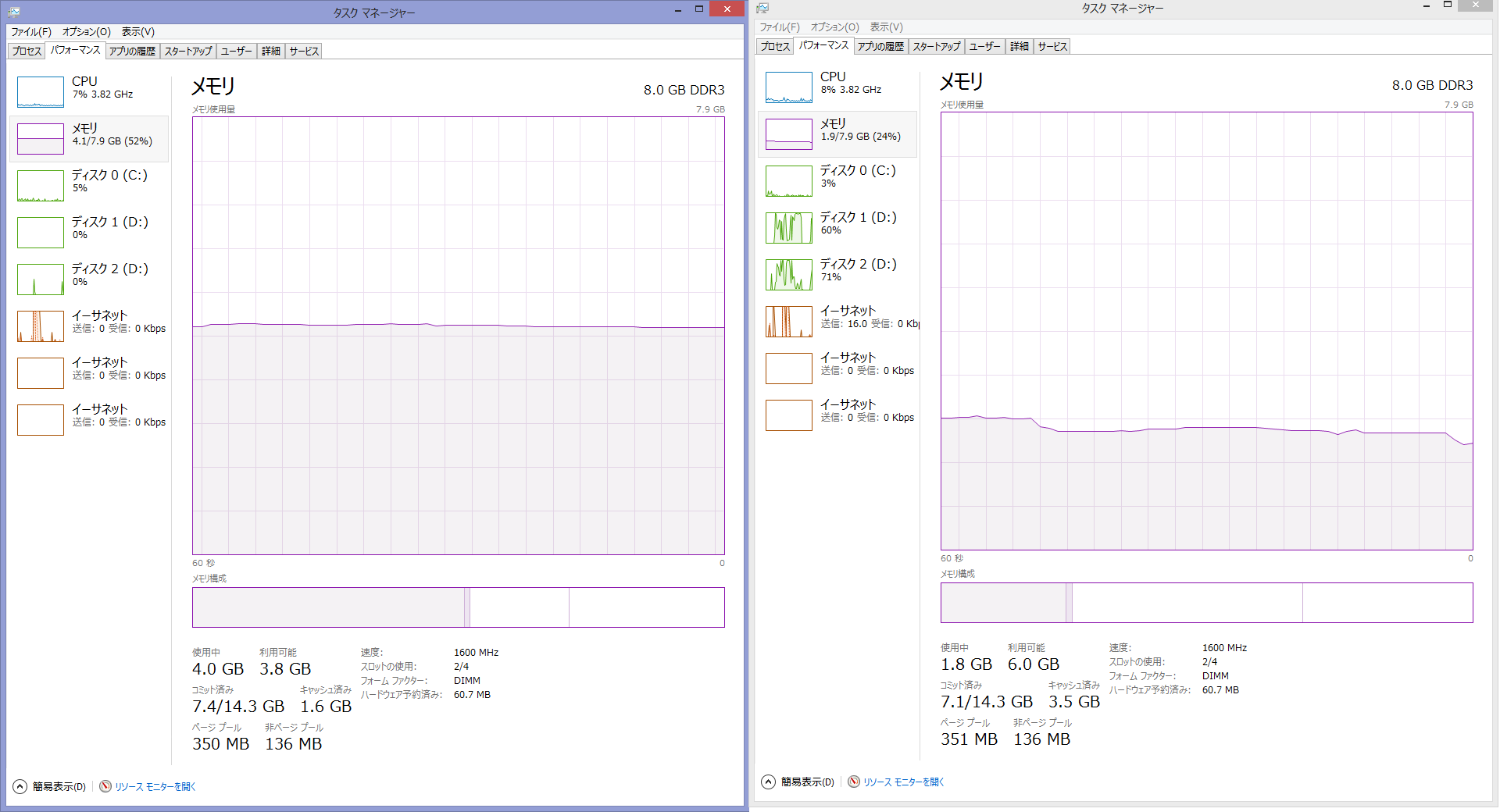 そのせいか、最近は特にメモリをバカ食いするソフトが増えてきたように感じます。某ブラウザとかな!