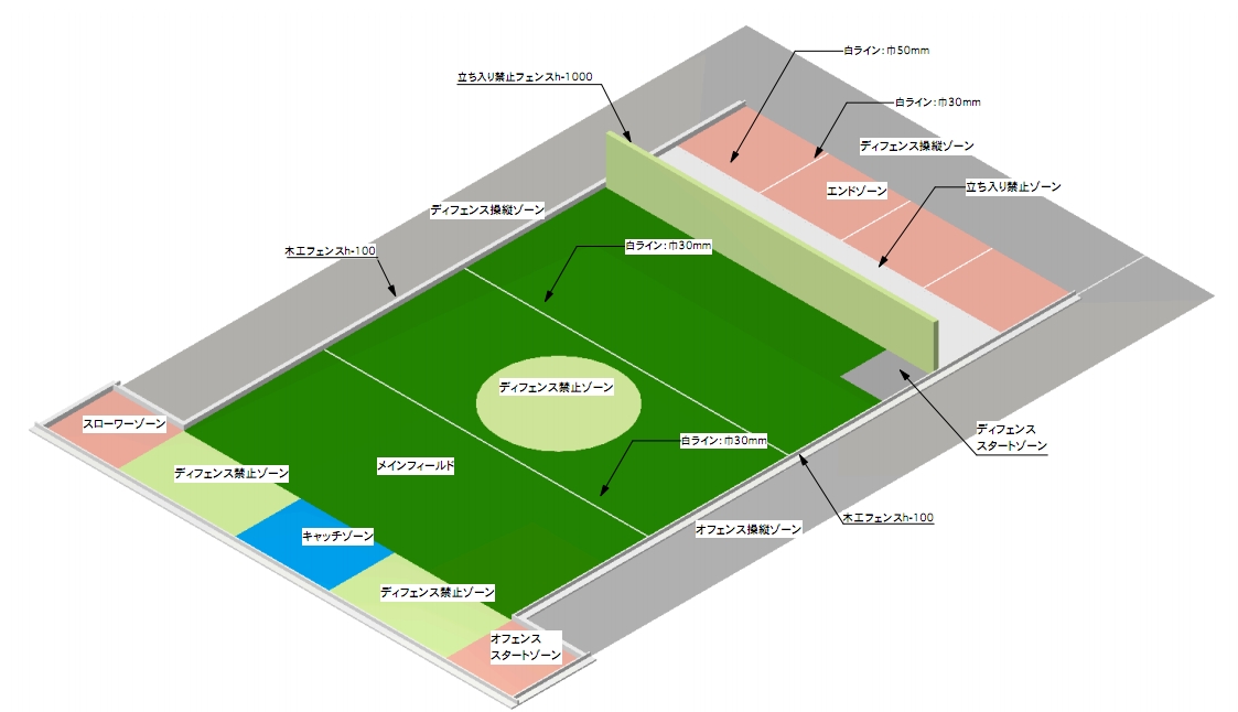 その後、オフェンスロボットはキャッチゾーンとディフェンス禁止ゾーンを含むメインフィ-ルドからなんとかして